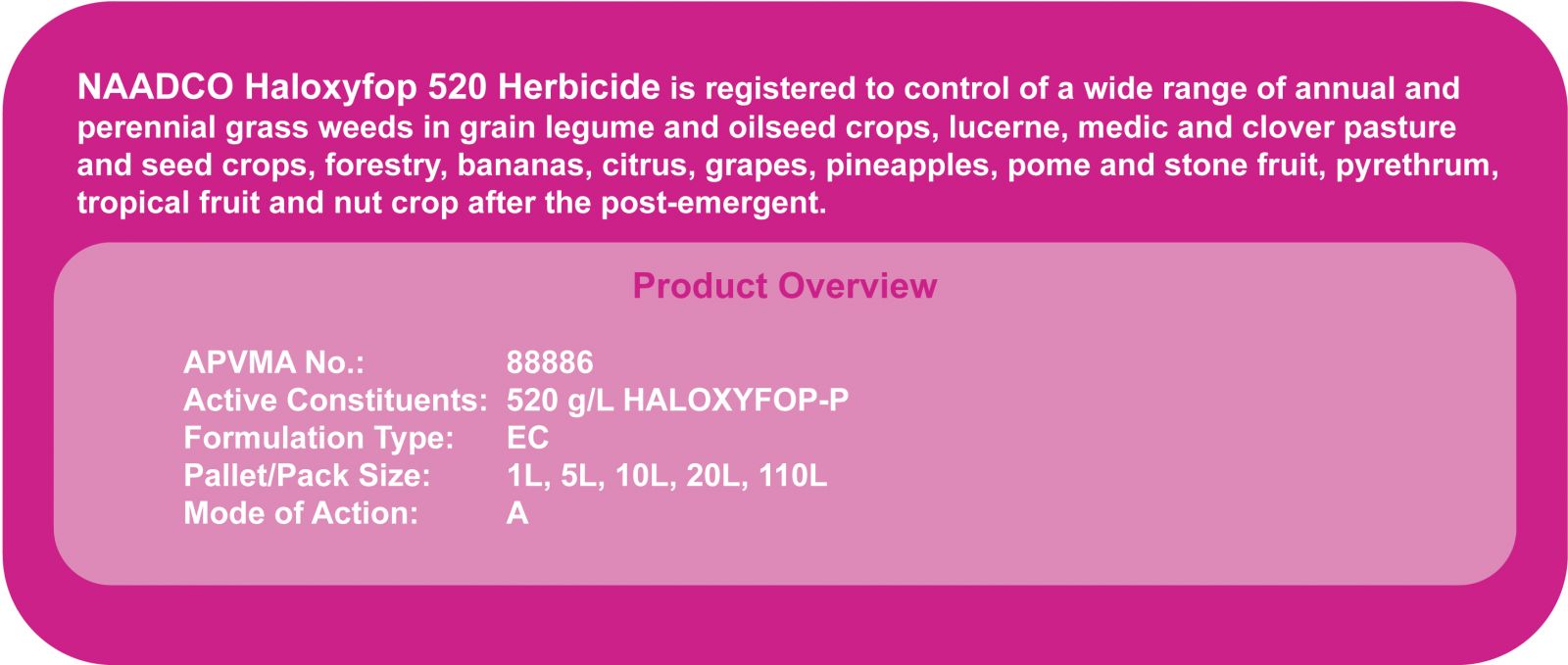 For the post-emergent control of a wide range of annual and perennial grass weeds in grain legume and oilseed crops, lucerne, medic and clover pasture and seed crops, forestry, bananas, citrus, grapes, pineapples, pome and stone fruit, pyrethrum, tropical fruit and nut crops.