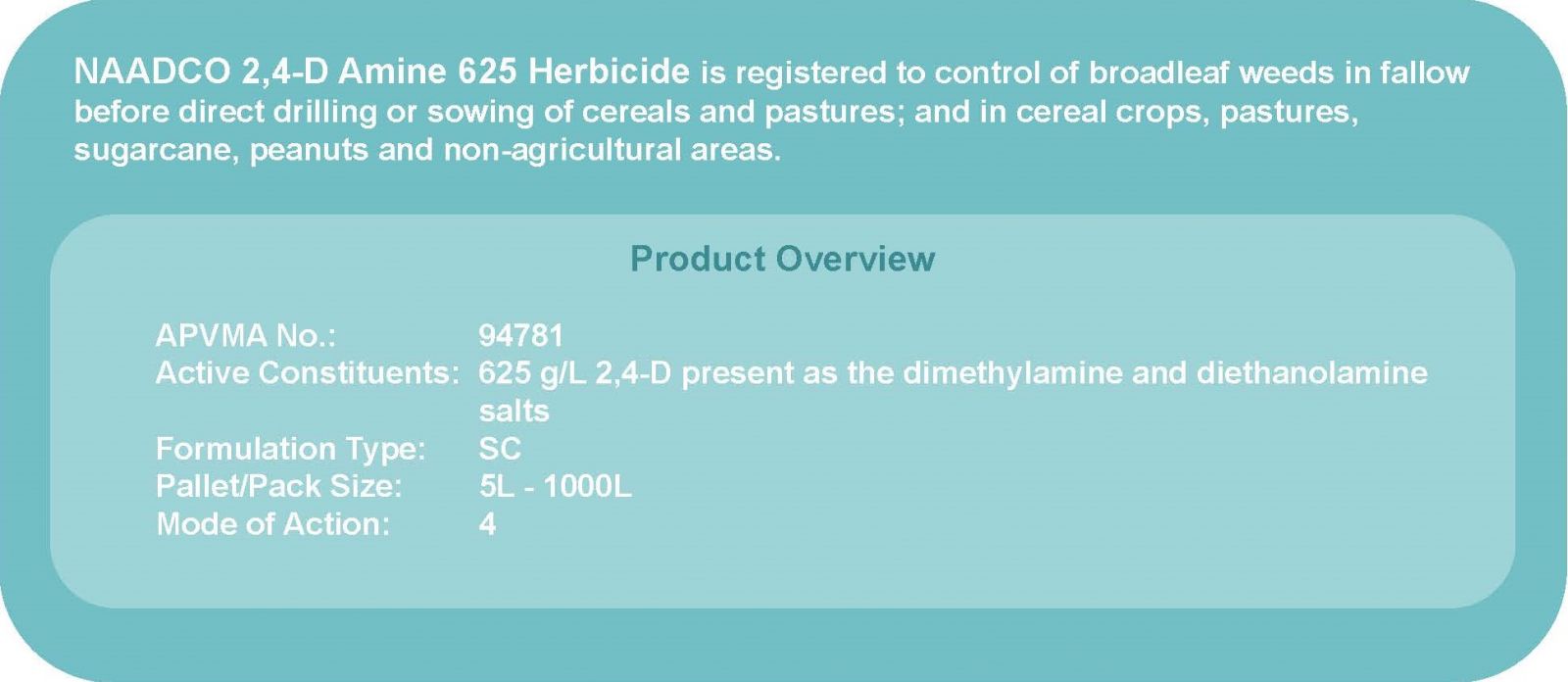 For the control of broadleaf weeds in fallow before direct drilling or sowing of cereals and pastures; and in cereal crops, pastures, sugarcane, peanuts and non-agricultural areas.