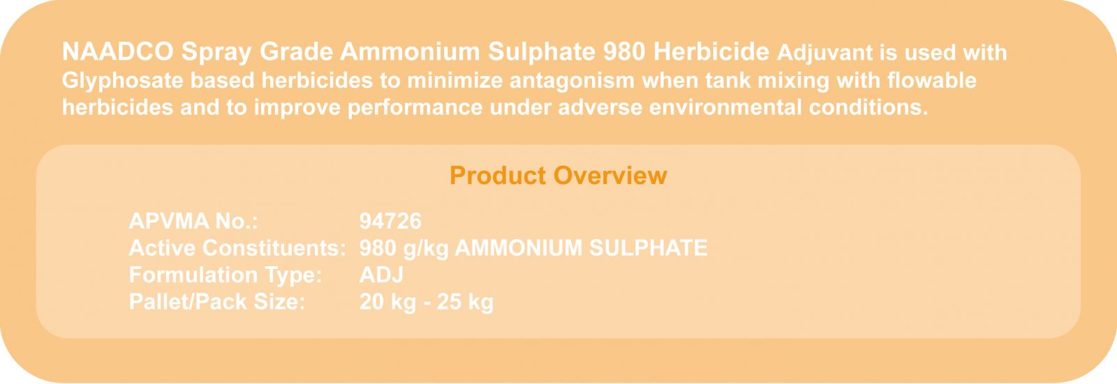 NAADCO SPRAY GRADE AMMONIUM SULPHATE 980 HERBICIDE ADJUVANT is used with Glyphosate based herbicides to minimize antagonism when tank mixing with flowable herbicides and to improve performance under adverse environmental conditions.